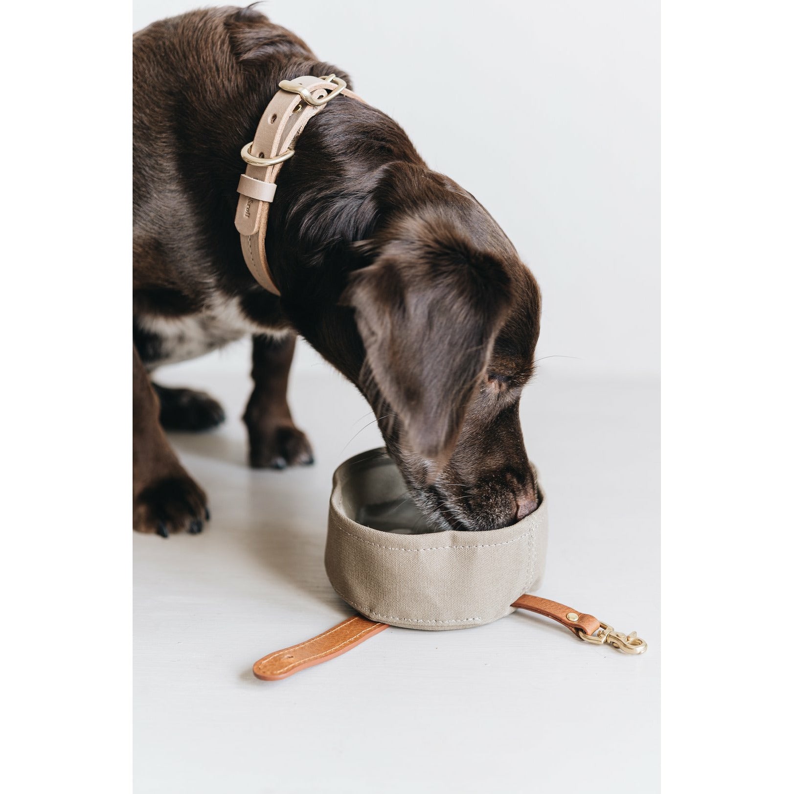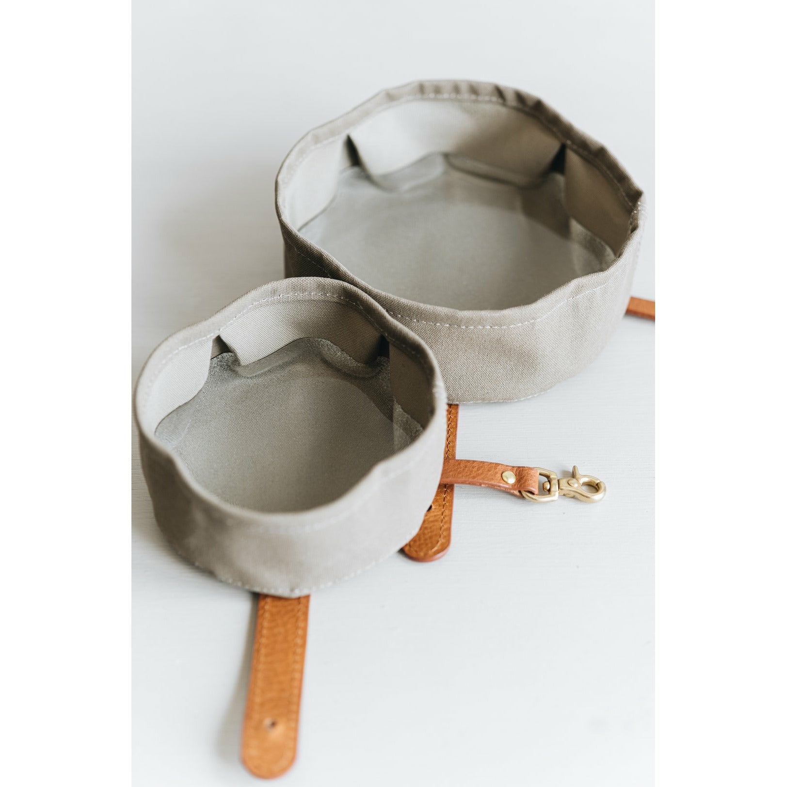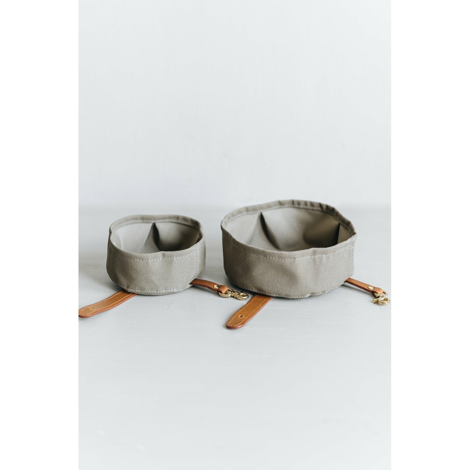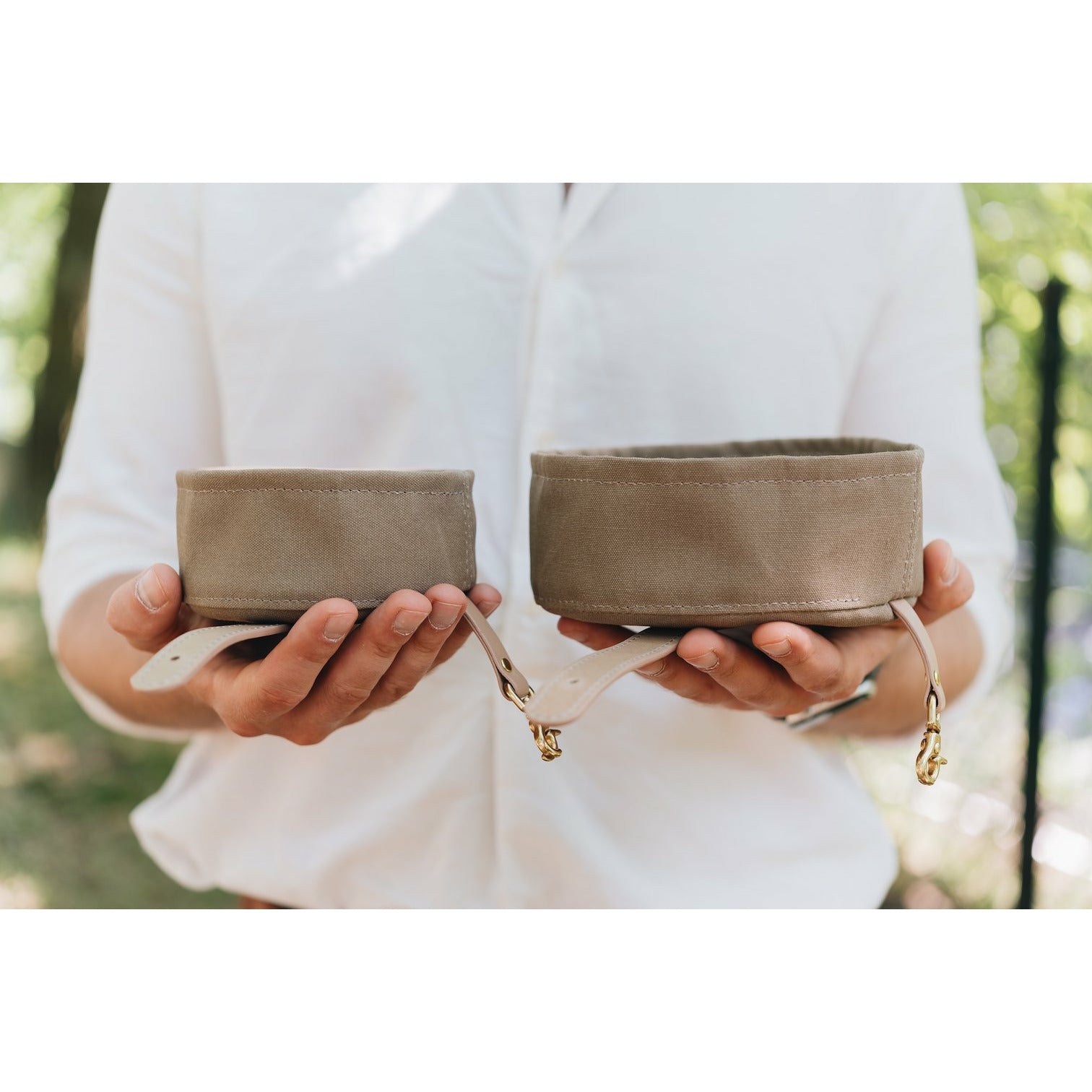 Der faltbare Reisenapf aus gewachstem Canvas mit Lederapplikationen ist handgefertigt in der Familienwerkstatt von band&roll in Berlin.