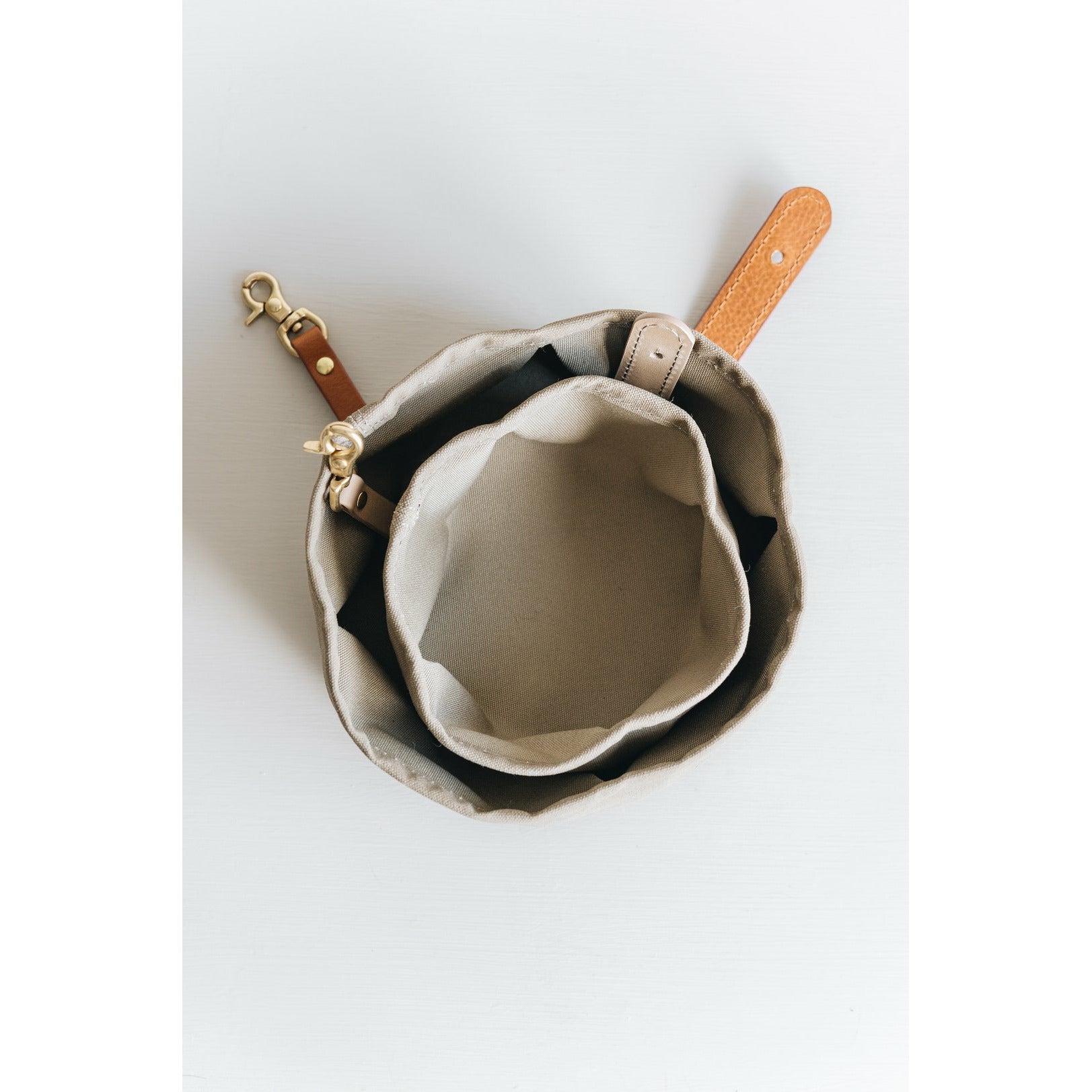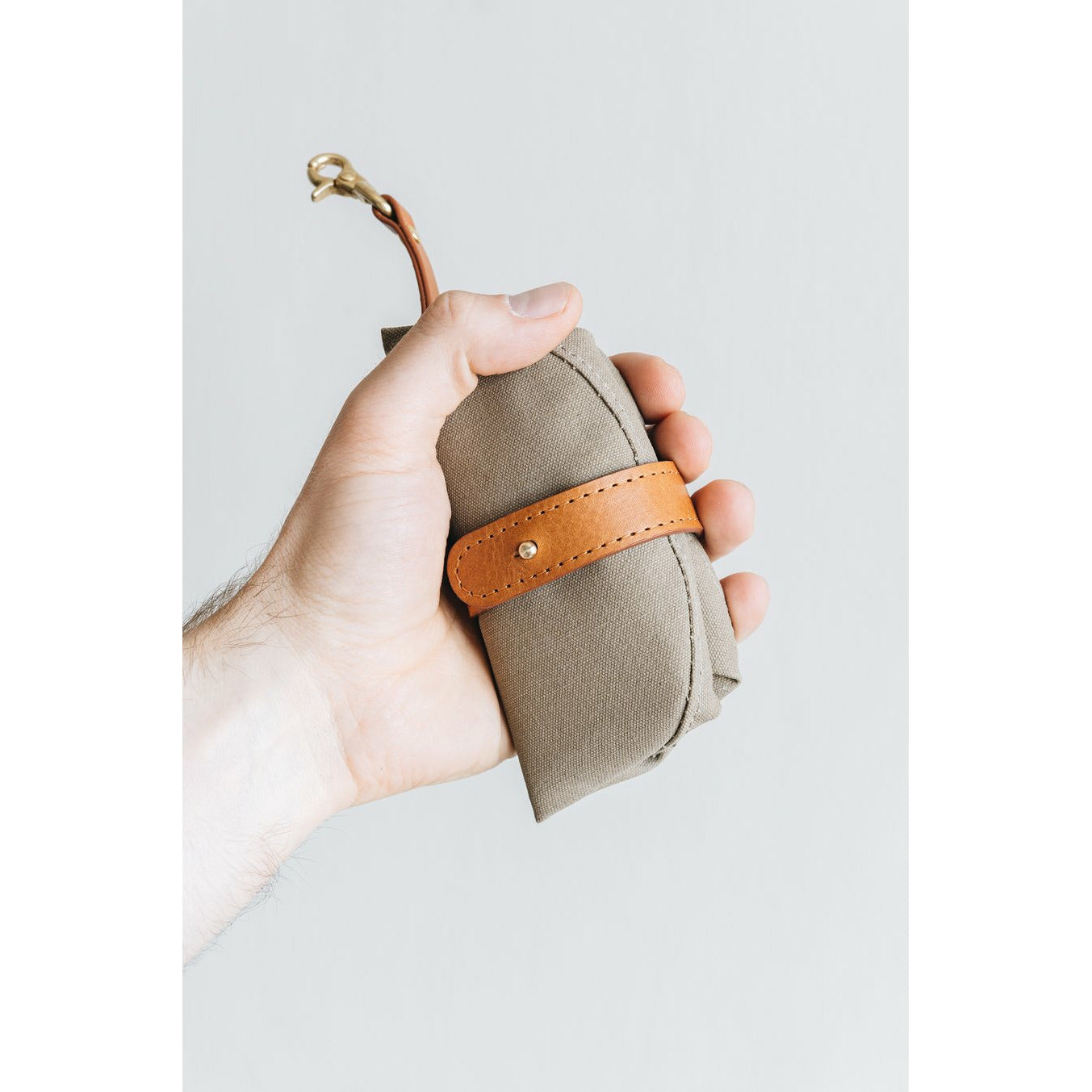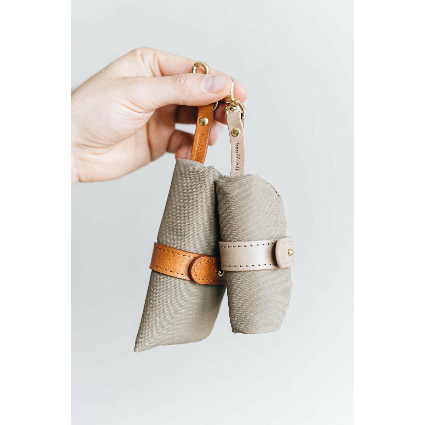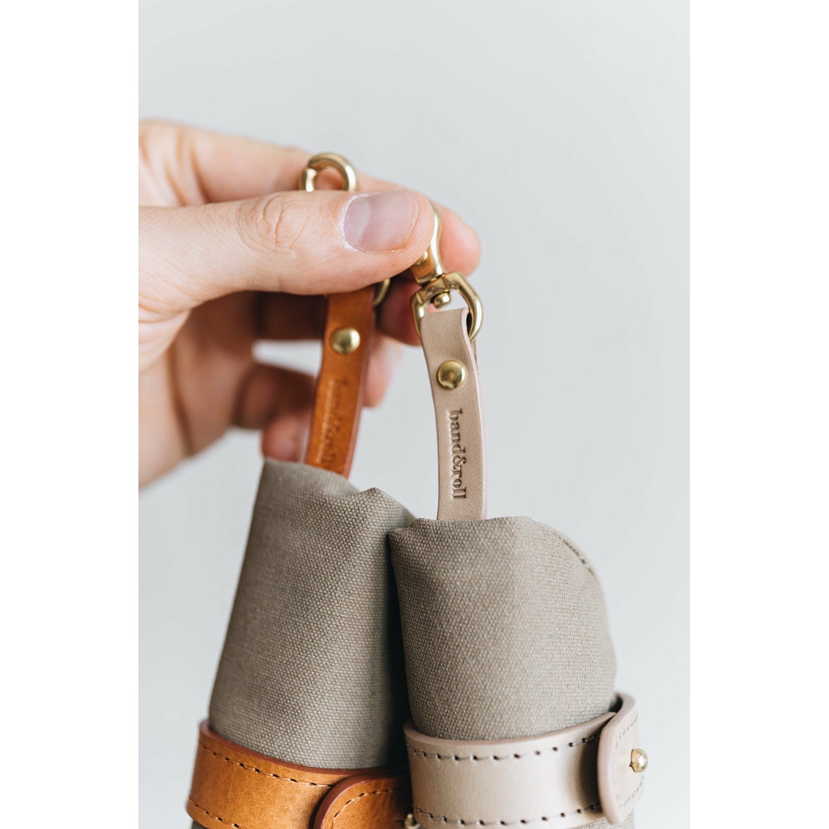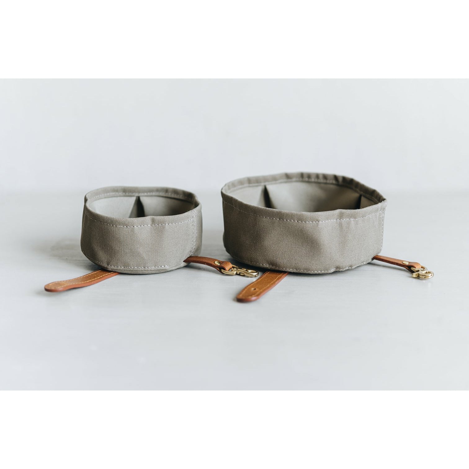 Der faltbare Reisenapf aus gewachstem Canvas mit Lederapplikationen ist handgefertigt in der Familienwerkstatt von band&roll in Berlin.