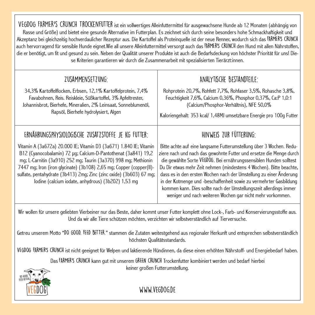 VEGDOG FARMER'S CRUNCH Trockenfutter ist ein vollwertiges Alleinfuttermittel für ausgewachsene Hunde ab 12 Monaten (abhängig von Rasse und Größe) und bietet eine gesunde Alternative im Futterplan.