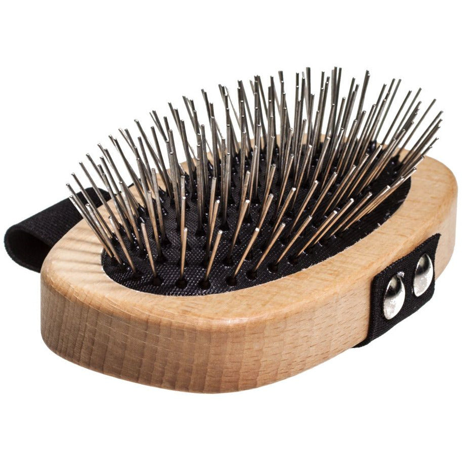 Zur Pflege des Fells gehört auch regelmäßiges Bürsten und Kämmen. Dadurch werden Schuppen und Schmutz entfernt und langes Haar vor Verfilzungen und Verknotungen geschützt. Gleichzeitig wird die Haut sanft massiert. Unsere Bürsten aus geöltem Buchenholz liegen optimal in der Hand und werden über ein flexibles Band an der Rückseite gehalten. Die Funktion ist aus dem Pferdesport bekannt: Die Bürste liegt direkt in der Hand, der Druck und die Intensität des Bürstens können besser dosiert werden. Unser Modell Langhaar zeichnet sich dadurch aus, dass die Metallstifte nicht ins Kissen zurück rutschen und nicht ausgezogen werden können.