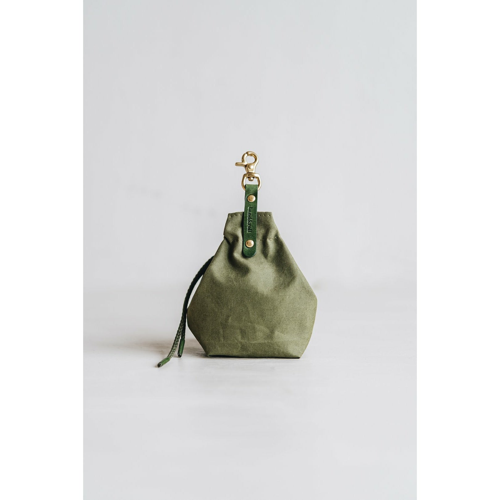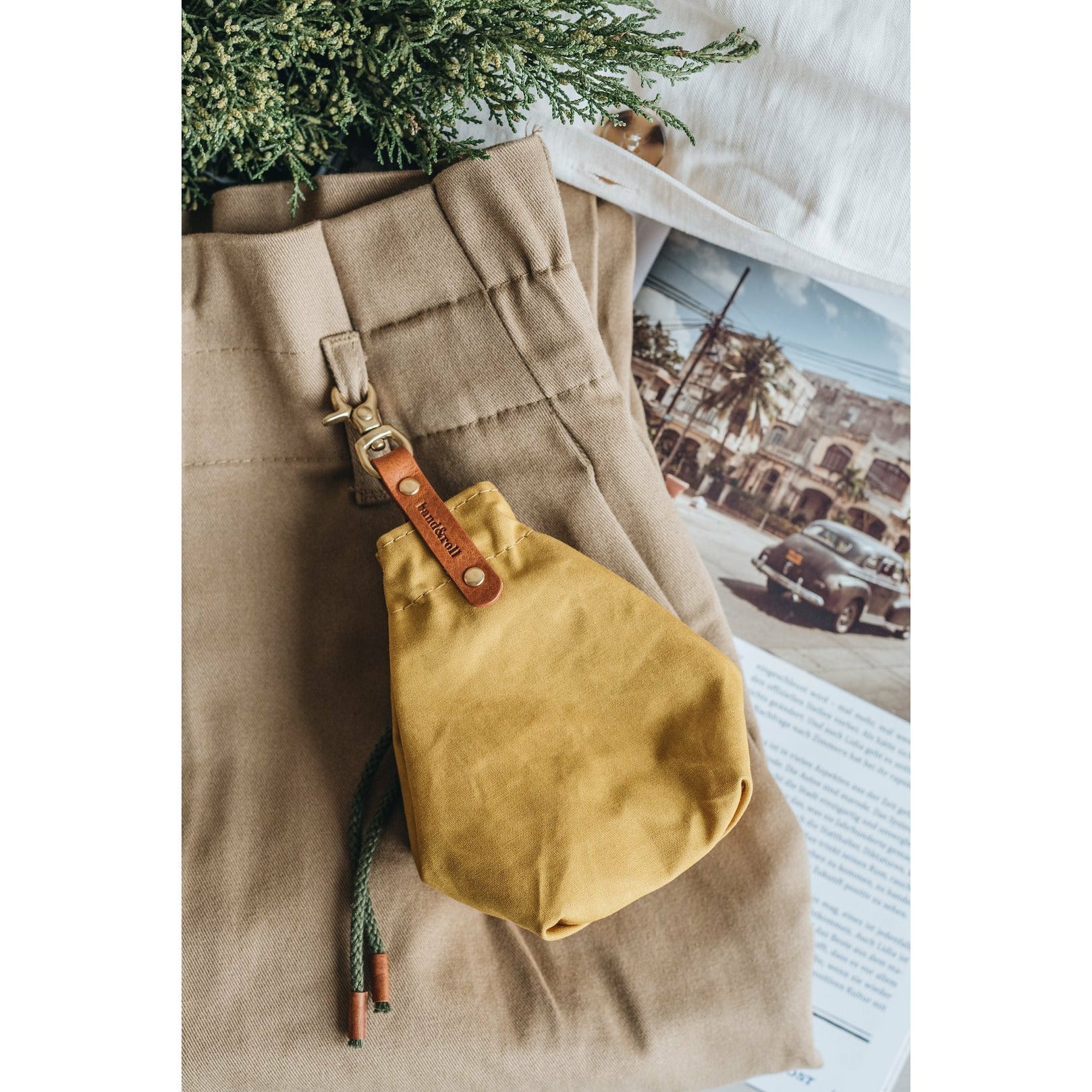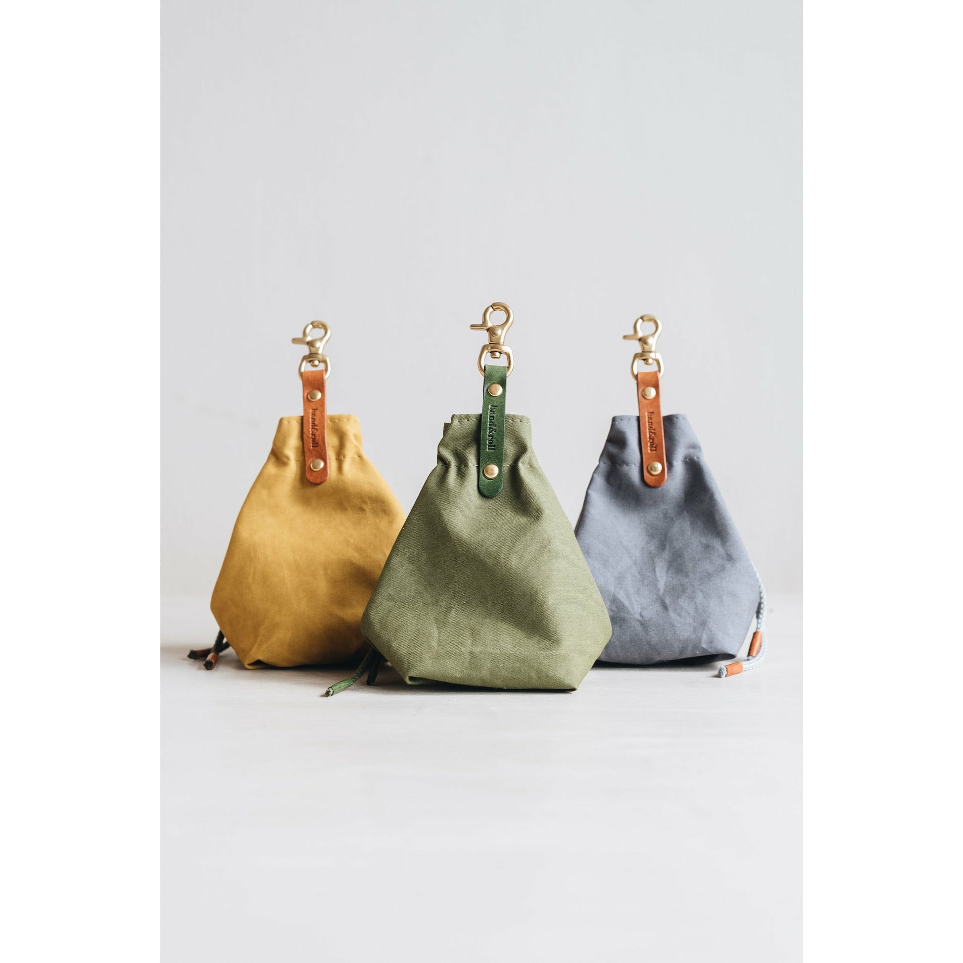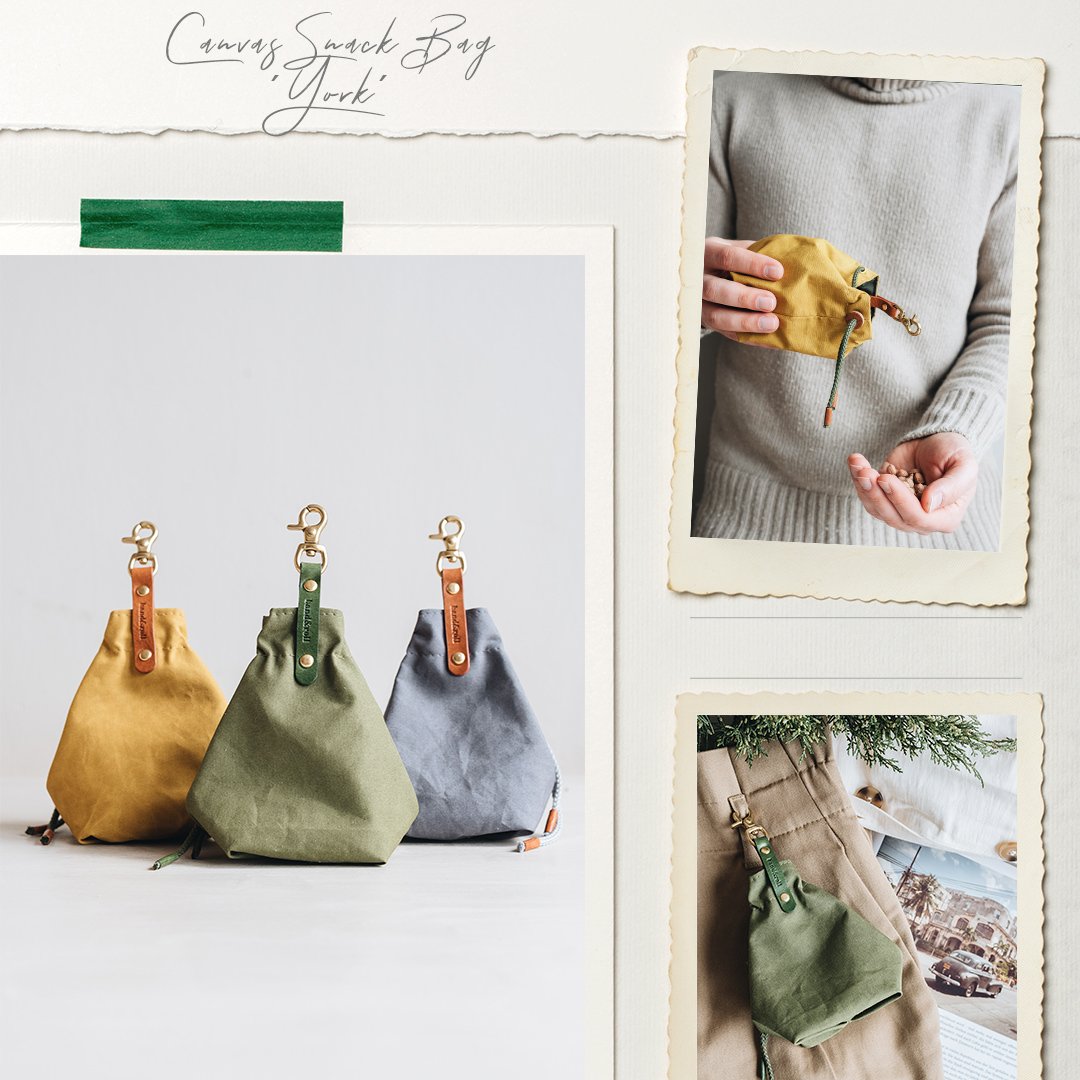 Die kleine Tasche aus gewachstem Canvas mit Leder- und Baumwollapplikationen ist perfekt für Leckerlis und ist handgefertigt in der Familienwerkstatt von band&roll in Berlin.