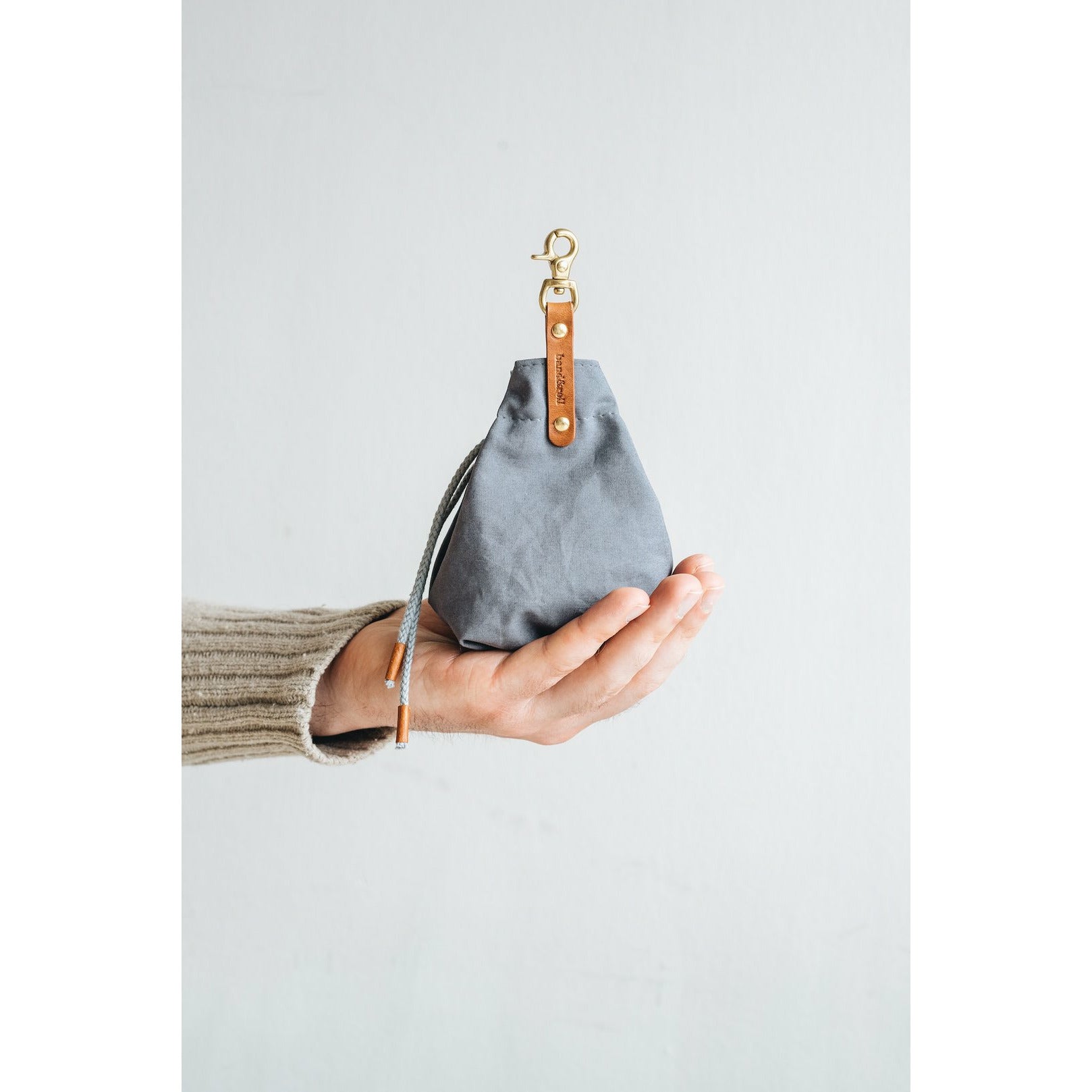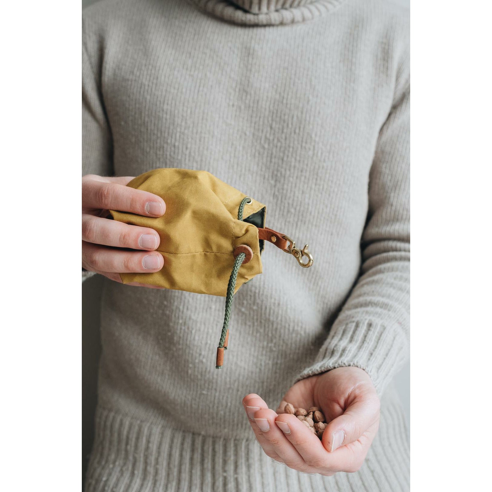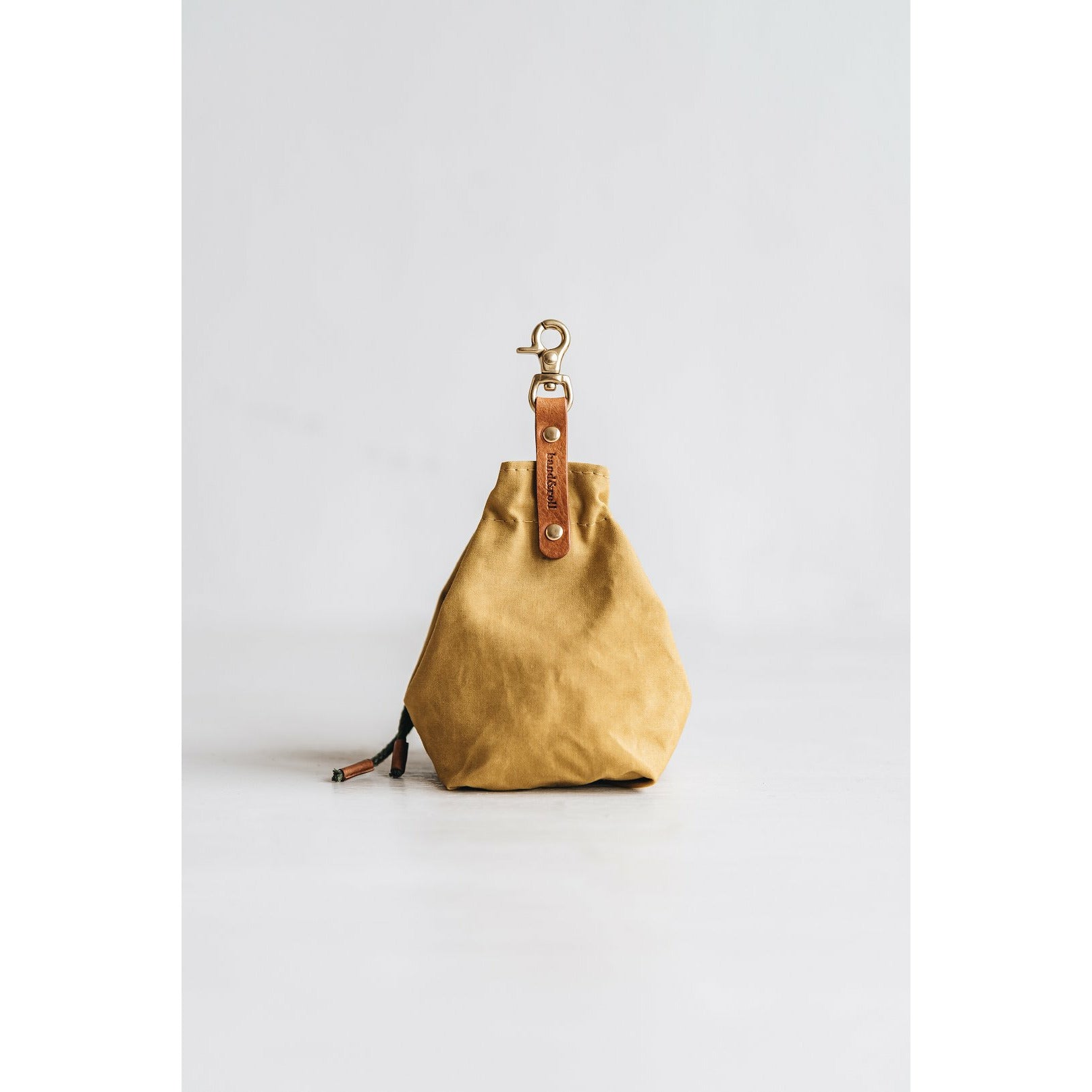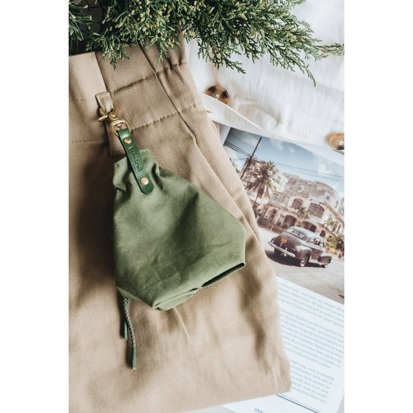 Die kleine Tasche aus gewachstem Canvas mit Leder- und Baumwollapplikationen ist perfekt für Leckerlis und ist handgefertigt in der Familienwerkstatt von band&roll in Berlin.