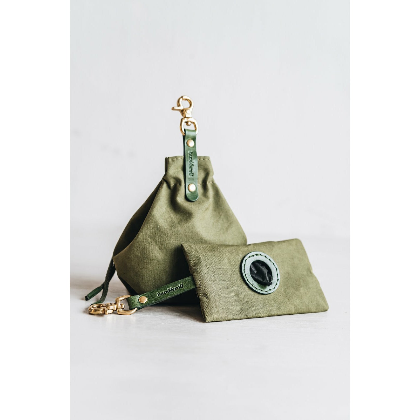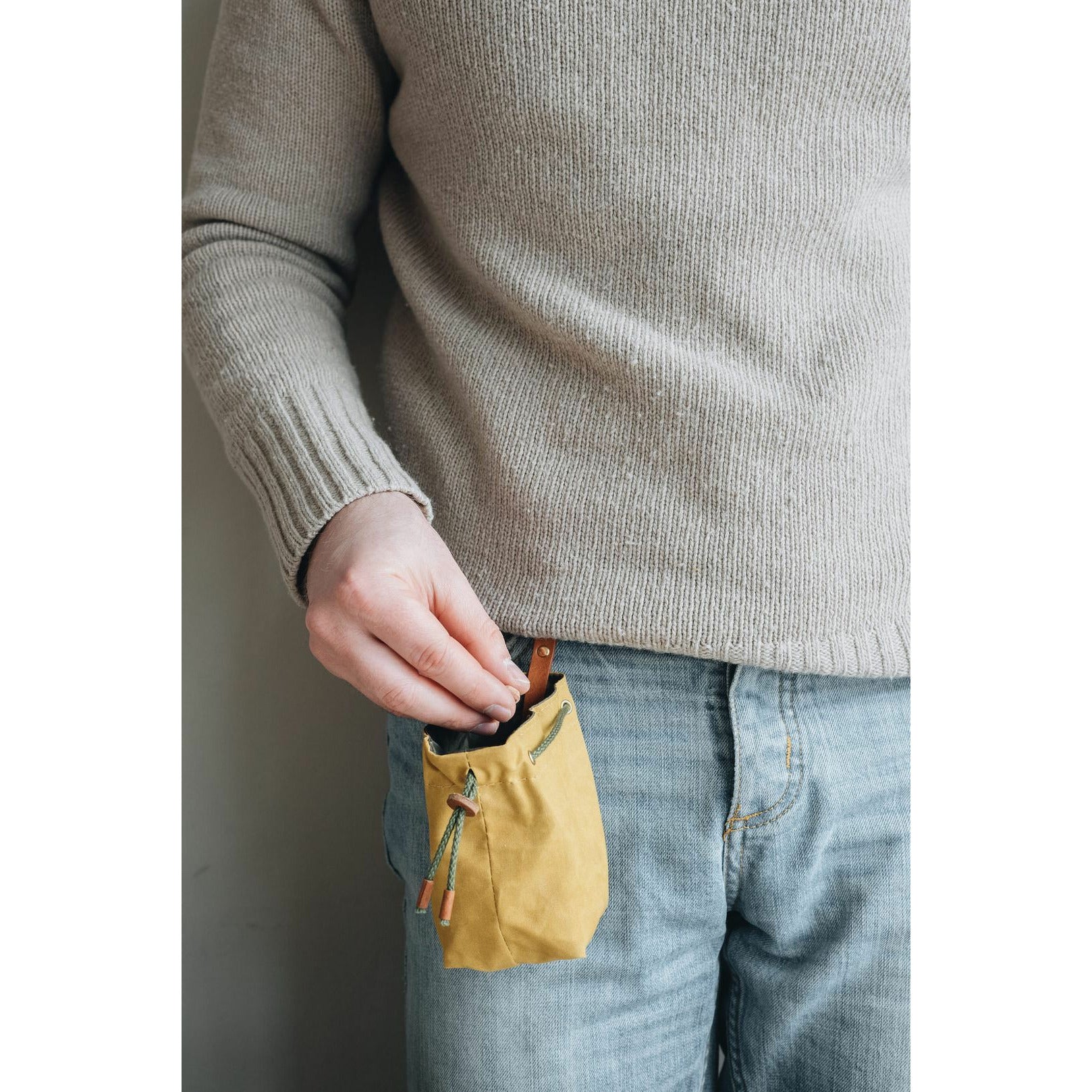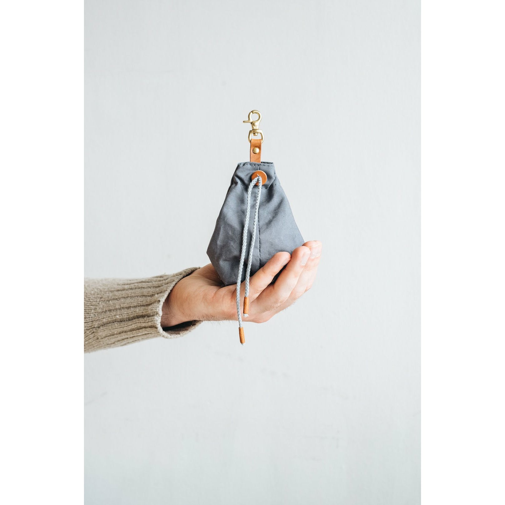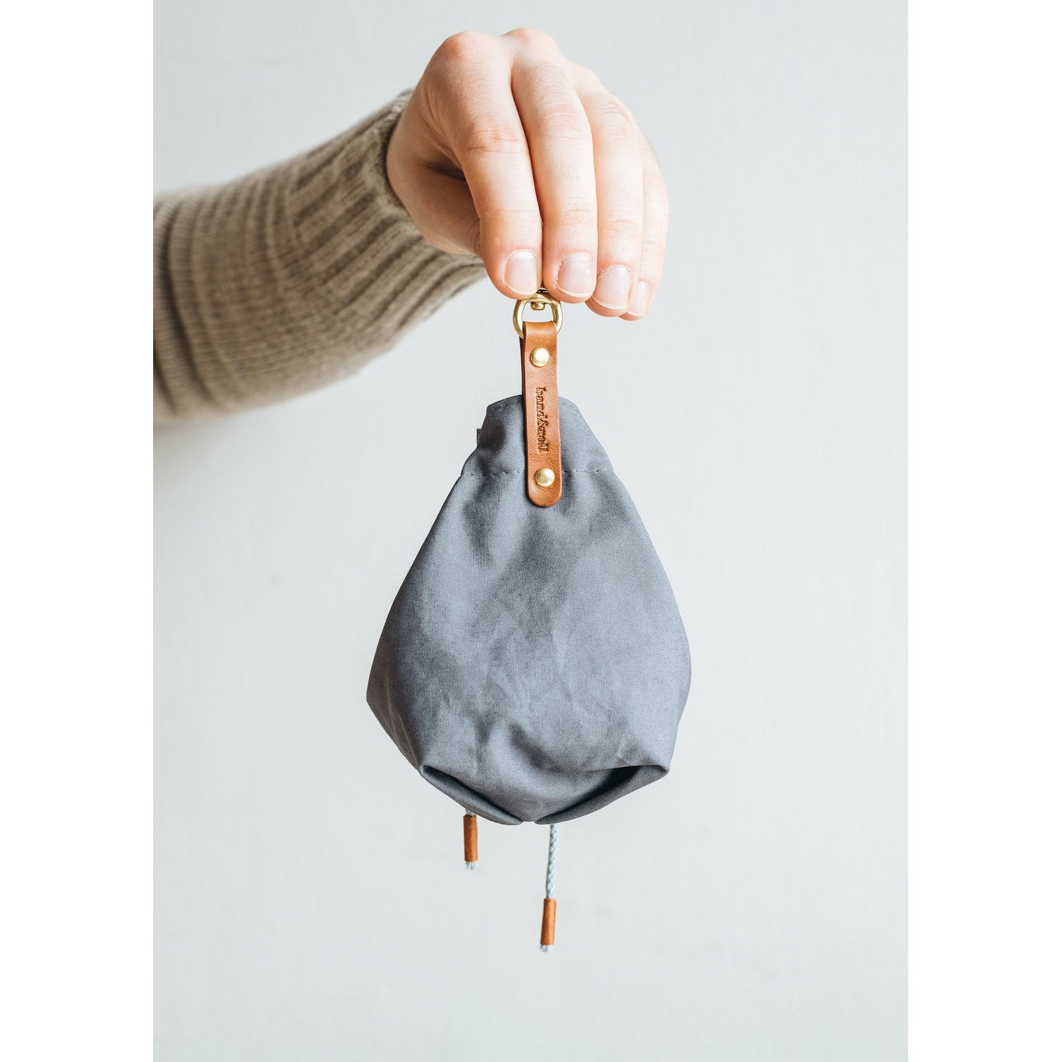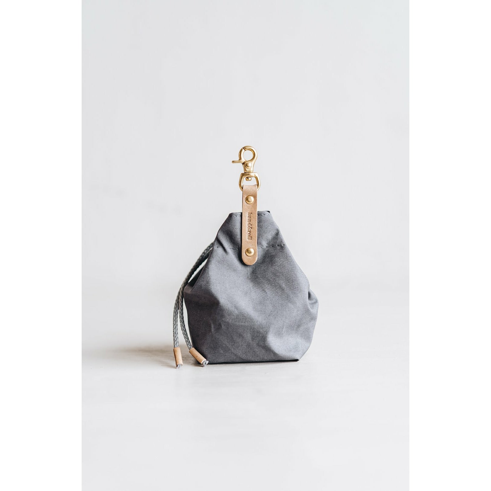 Die kleine Tasche aus gewachstem Canvas mit Leder- und Baumwollapplikationen ist perfekt für Leckerlis und ist handgefertigt in der Familienwerkstatt von band&roll in Berlin.