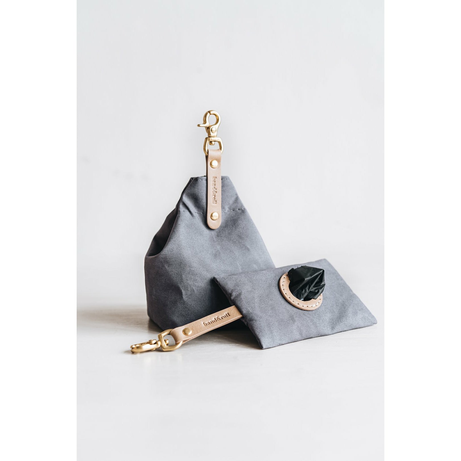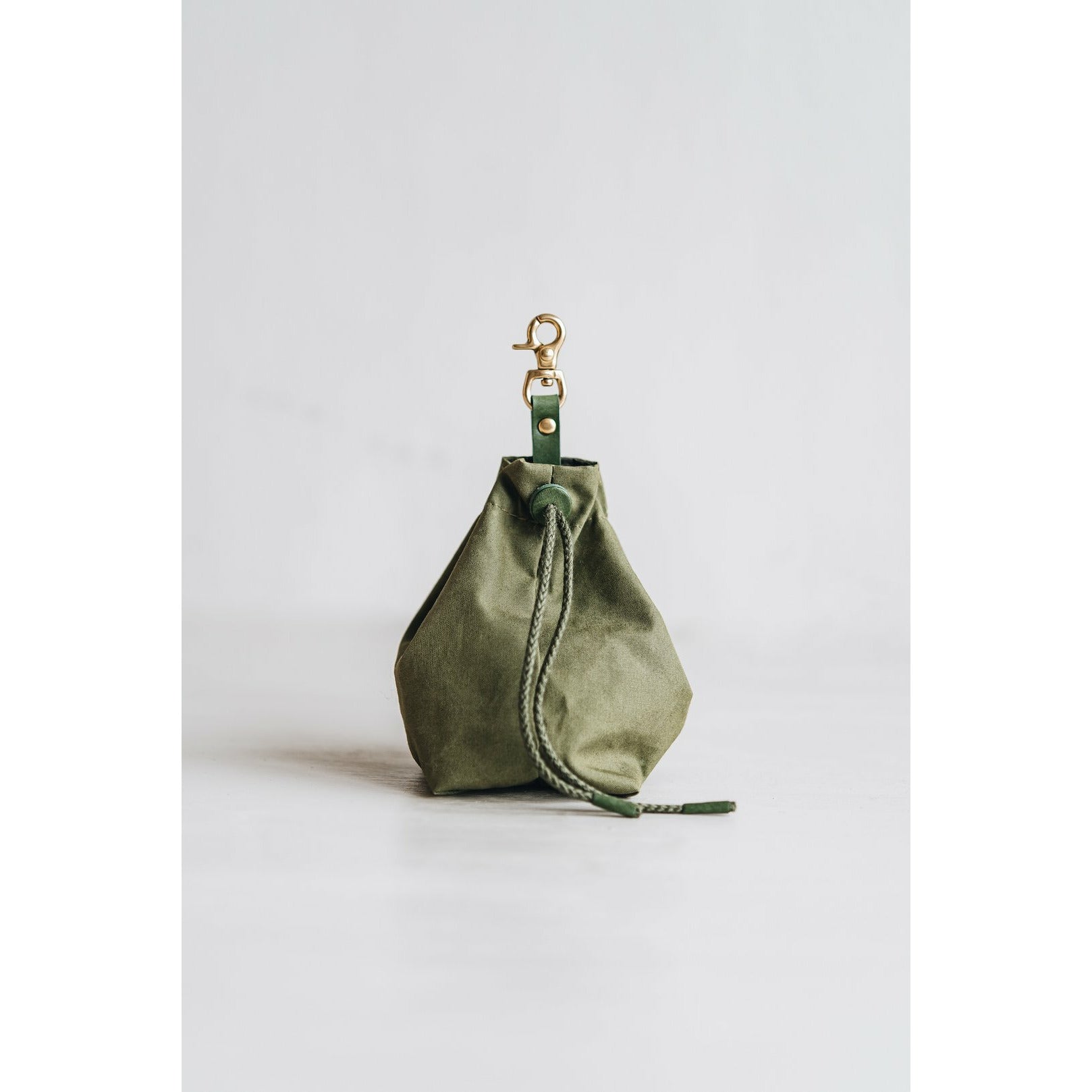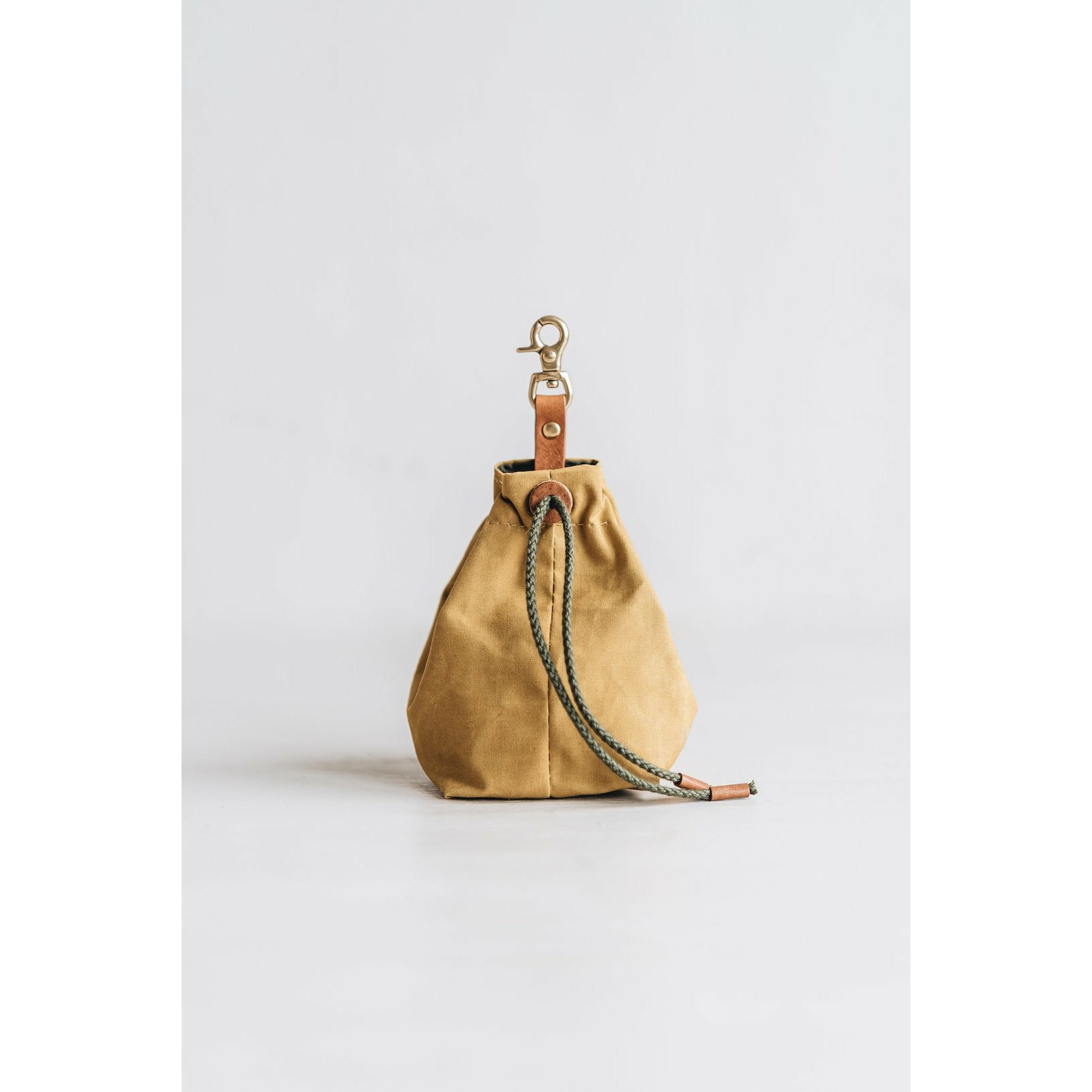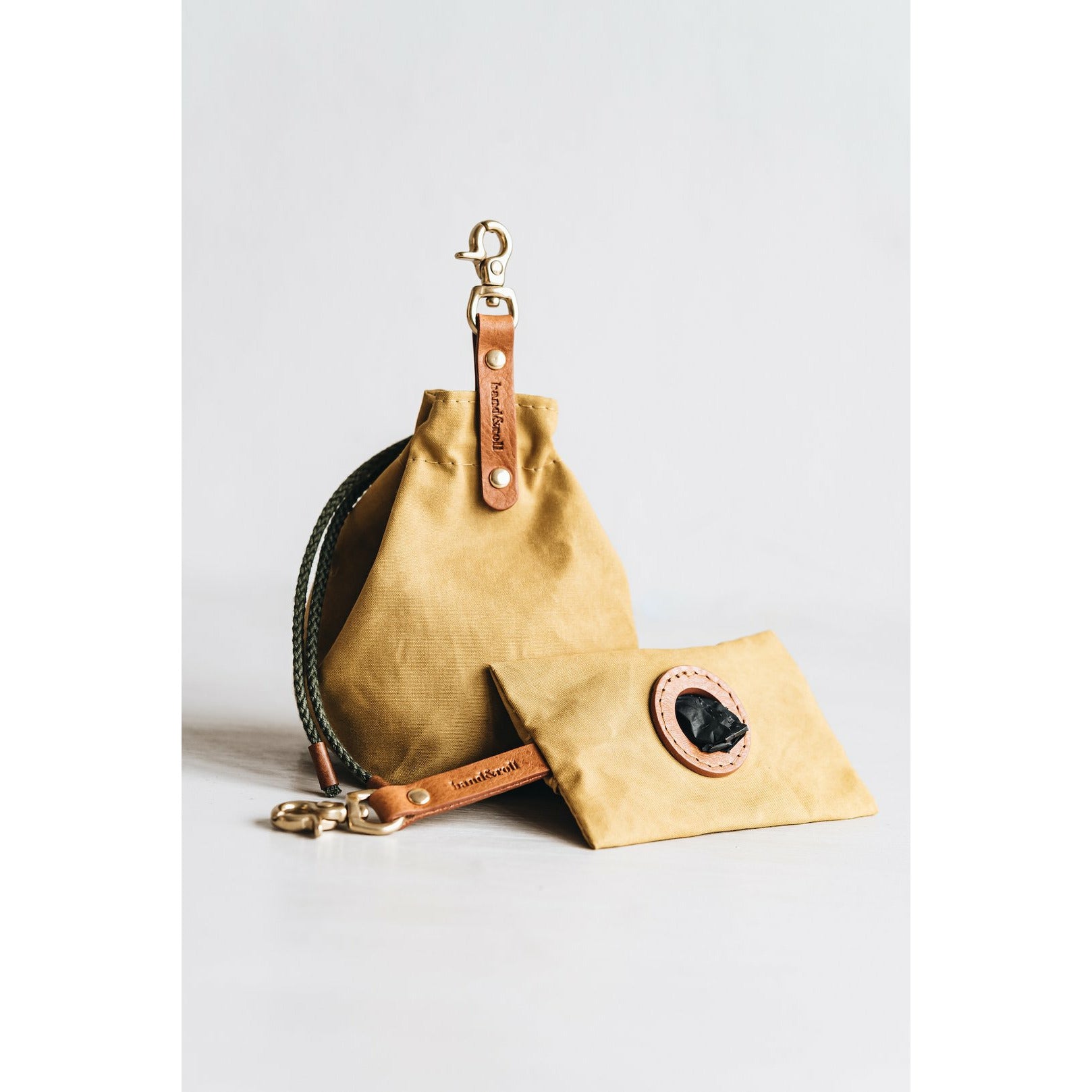 Die kleine Tasche aus gewachstem Canvas mit Leder- und Baumwollapplikationen ist perfekt für Leckerlis und ist handgefertigt in der Familienwerkstatt von band&roll in Berlin.