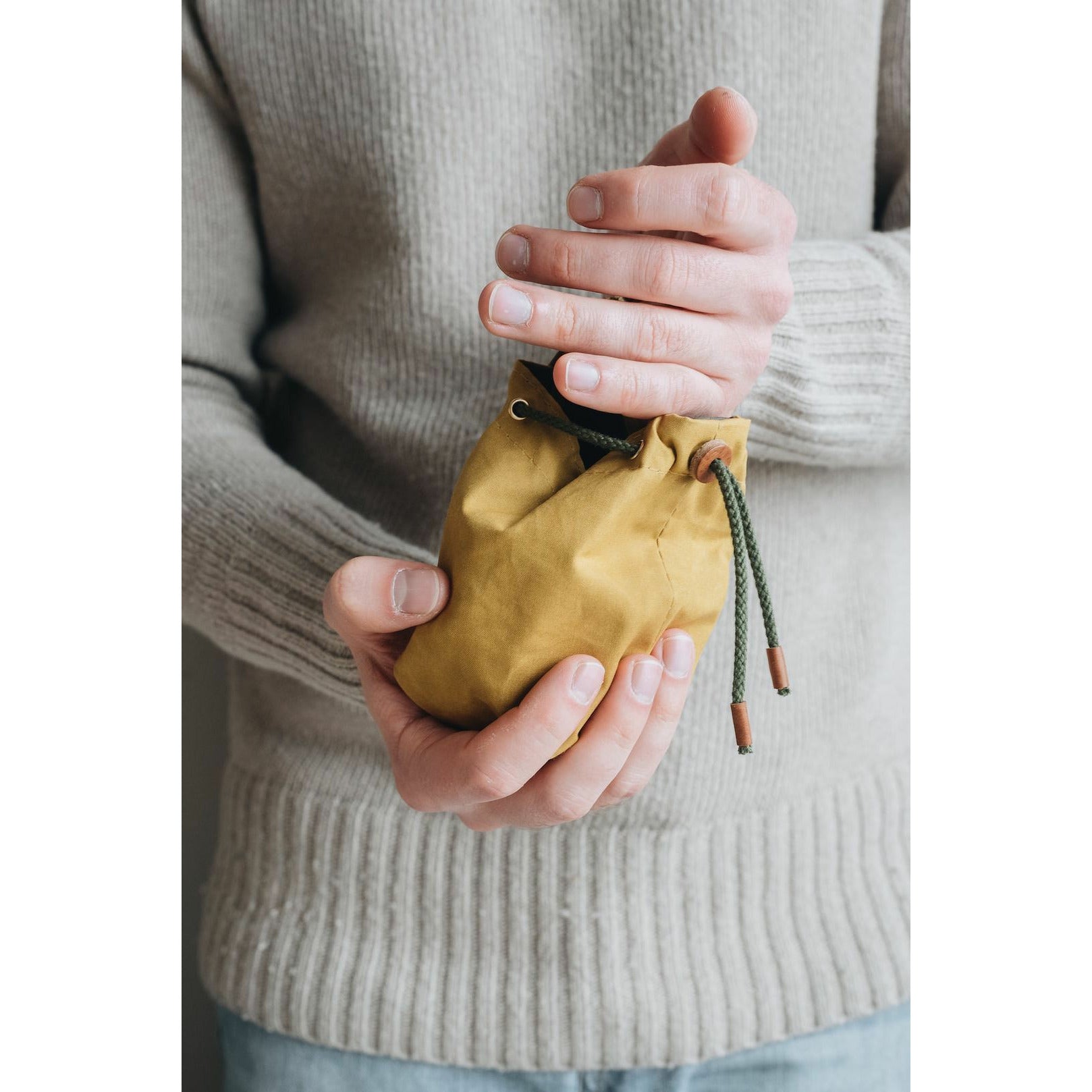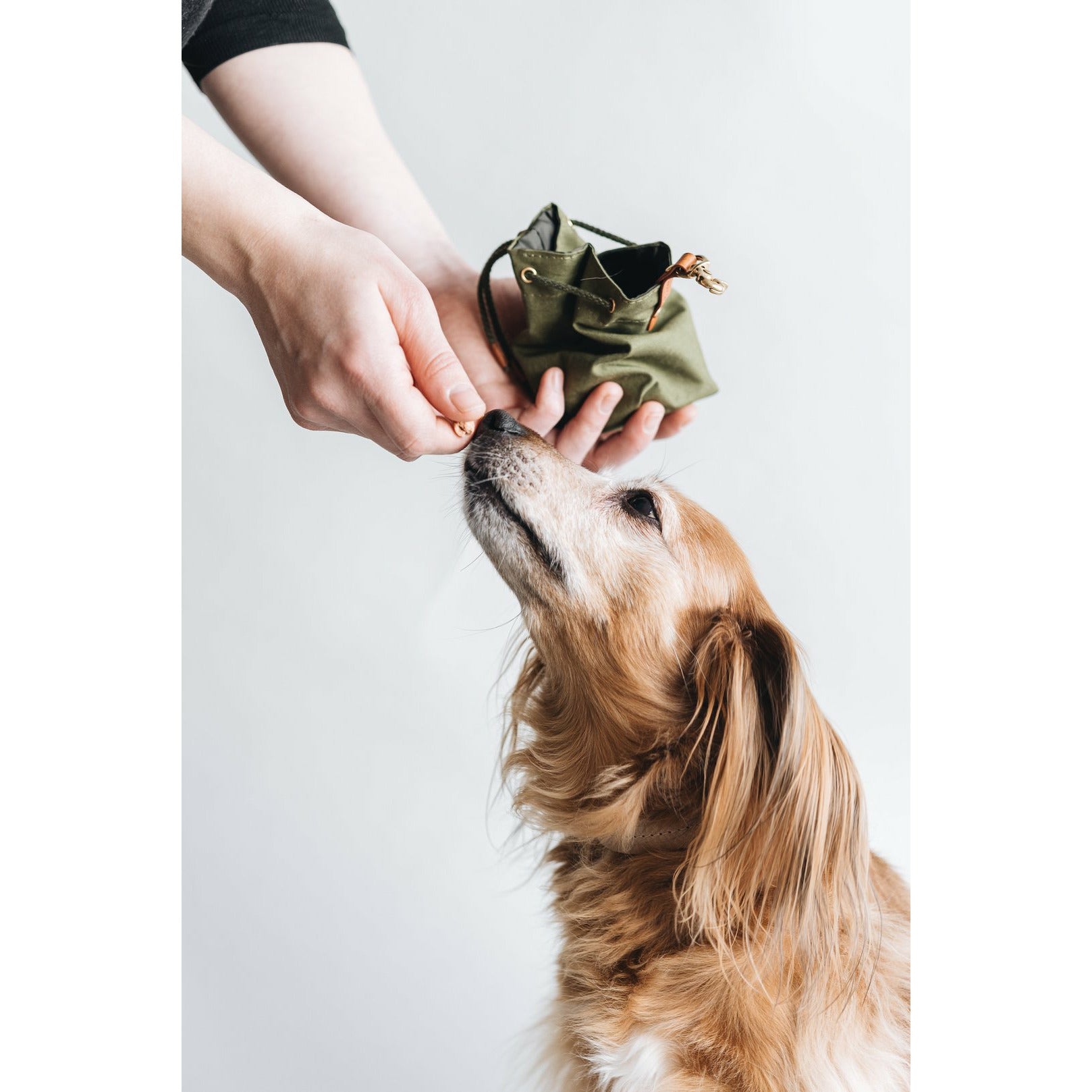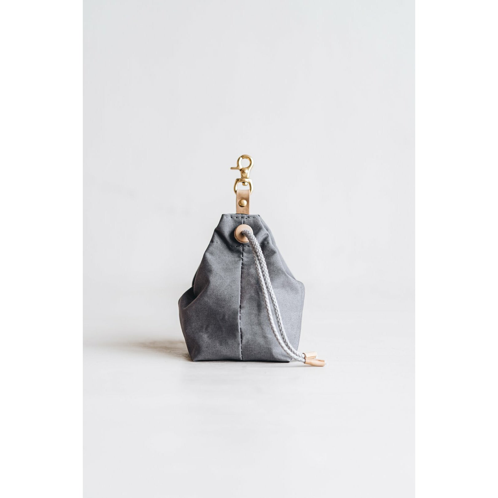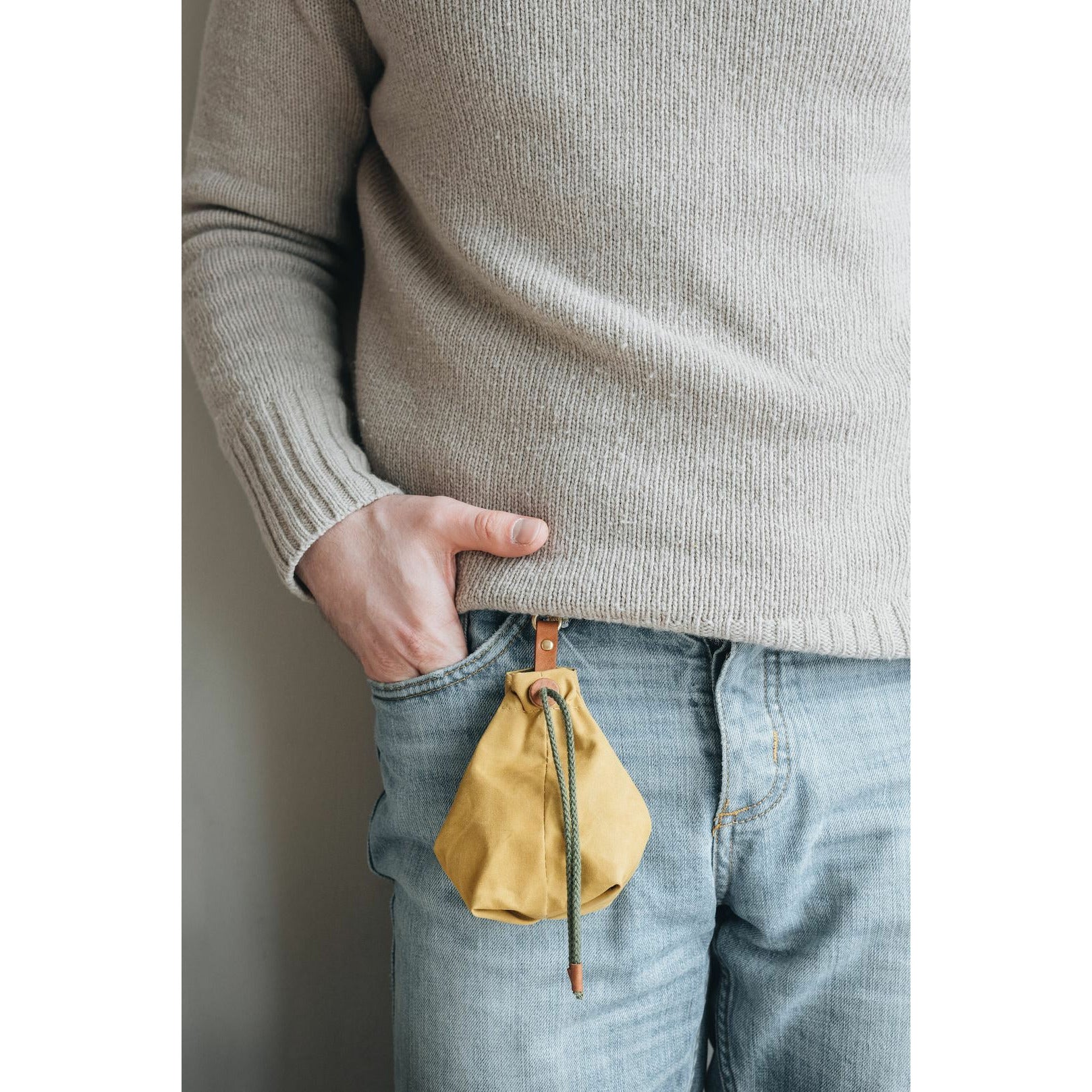 Die kleine Tasche aus gewachstem Canvas mit Leder- und Baumwollapplikationen ist perfekt für Leckerlis und ist handgefertigt in der Familienwerkstatt von band&roll in Berlin.