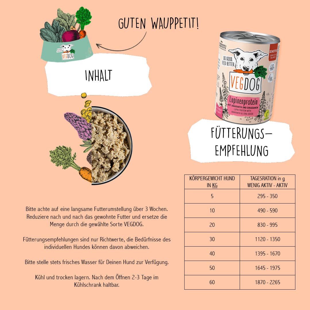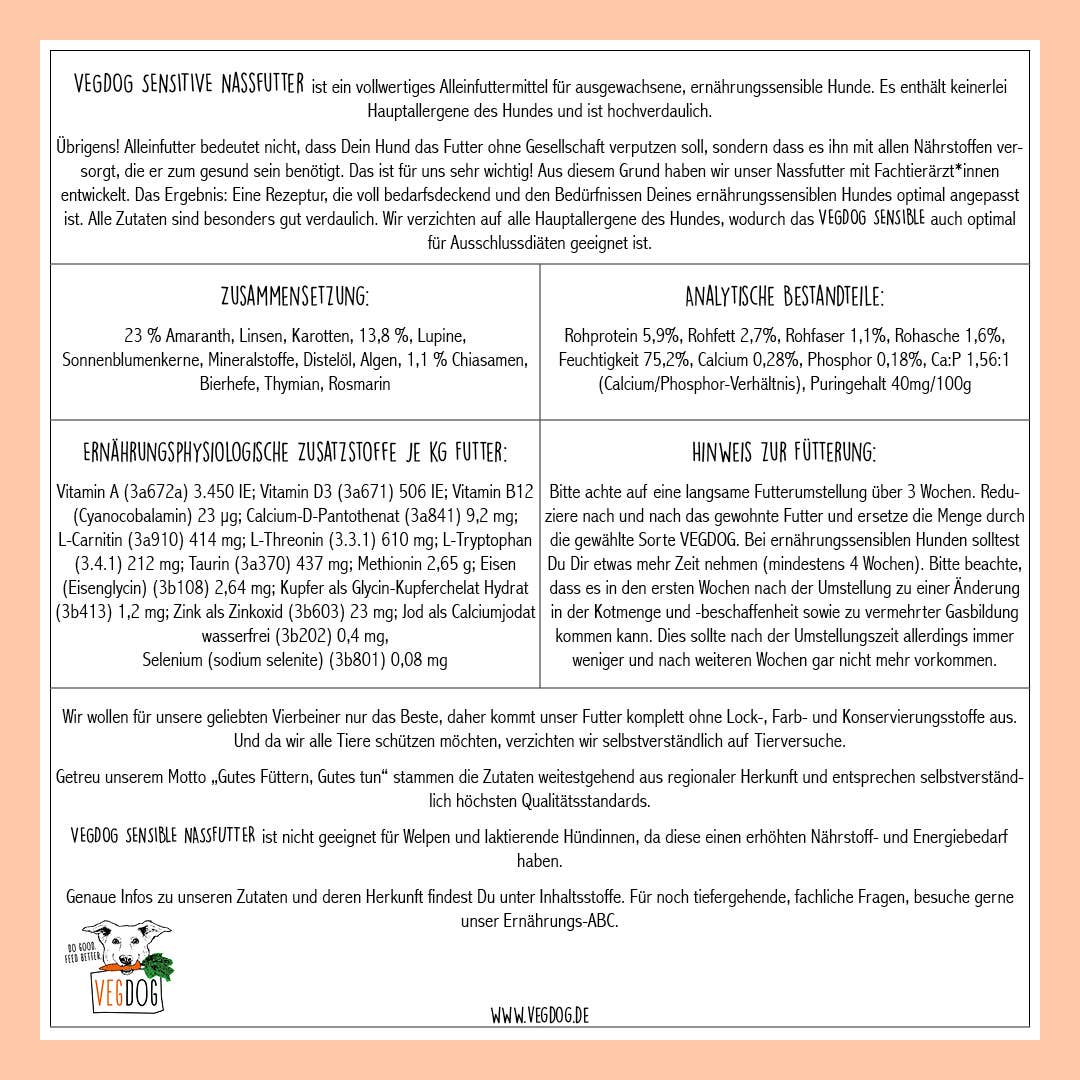 Das VEGDOG SENSITIVE Lupinenprotein ist ein vollwertiges Alleinfuttermittel mit leicht verdaulichen Zutaten, alternativen Proteinquellen und essentiellen Fettsäuren. Das Nassfutter ist besonders für Allergiker und sensible Hunde ab zwölf Monaten geeignet.