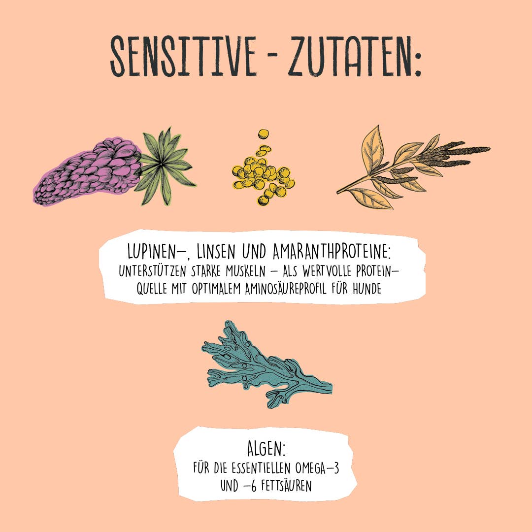 Wir verzichten auf alle Hauptallergene des Hundes. Für die ausreichende Deckung des Eiweißbedarfs haben wir Lupinen-, Linsen- und Amaranthproteine verwendet. Diese wertvollen Proteinquellen verfügen über ein optimales Aminosäureprofil für Hunde und stärken damit die Muskeln Deines Vierbeiners. Die zugesetzten Algen stellen die essentiellen Omega-3- und -6-Fettsäuren bereit. Die Super-Zutat Distelöl und die enthaltene Linolsäure sind gut für die Haut und können entzündungshemmend wirken. Abgerundet wird das SENSITIVE durch die Zugabe von gesunden Kräutern wie Löwenzahn, Kamillenblüte und Melissenkraut.