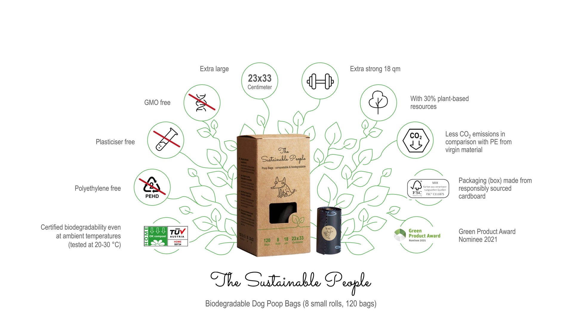 Die biologisch abbaubaren Hundekotbeutel von The Sustainable People sind OK Compost HOME zertifiziert (getestet bei 20-30 °C) und können daher auch bei niedrigen Temperaturen, wie sie in der Umwelt erreicht werden, von Mikroorganismen abgebaut werden. Nur so kann gewährleistet werden, dass ein Abbau auch außerhalb der industriellen Kompostierung möglich ist. Die Beutel werden aus nachwachsenden Rohstoffen hergestellt und sind frei von Weichmachern, Polyethylen und genmanipulierten Stoffen. Die Verpackung (Box) besteht aus FSC zertifiziertem Material, der Rollenkern besteht aus Pappe. Mit einer Dicke von 18 Mikrometer sind die Kotbeutel angenehm dick, blickdicht, besonders reißfest und feuchtigkeitsbeständig. Dies und die große Ausführung (23 x 33 cm) ermöglichen eine einfache und sichere Entsorgung von Hundekot.
