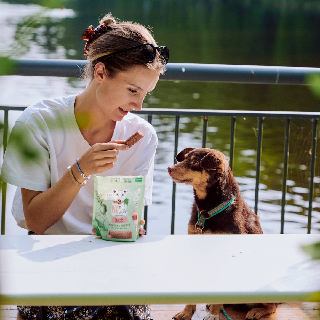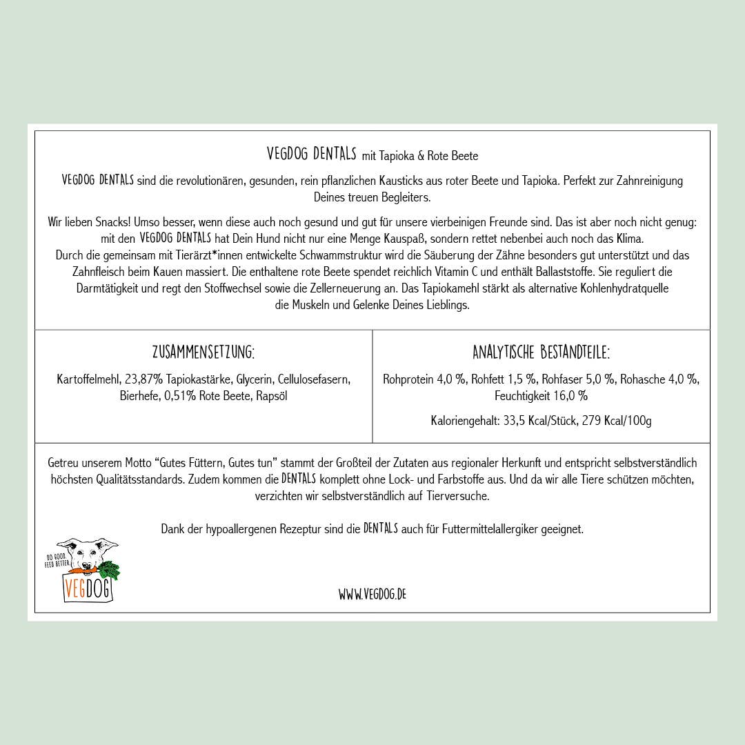 VEGDOG DENTALS sind die revolutionären, gesunden, rein pflanzlichen Kausticks aus roter Beete und Tapioka. Perfekt zur Zahnreinigung Deines treuen Begleiters. Durch die gemeinsam mit Tierärzt*innen entwickelte Schwammstruktur wird die Säuberung der Zähne besonders gut unterstützt und das Zahnfleisch beim Kauen massiert. Die enthaltene rote Beete spendet reichlich Vitamin C und enthält Ballaststoffe. Sie reguliert die Darmtätigkeit und regt den Stoffwechsel sowie die Zellerneuerung an. Das Tapiokamehl stärkt als alternative Kohlenhydratquelle die Muskeln und Gelenke Deines Lieblings. Dank der hypoallergenen Rezeptur sind die DENTALS auch für Futtermittelallergiker geeignet. Wir wollen für unsere geliebten Vierbeiner nur das Beste, daher kommen die DENTALS komplett ohne Lock-, Farb- und Konservierungsstoffe aus. Und da wir alle Tiere schützen möchten, wird selbstverständlich auf Tierversuche verzichtet.