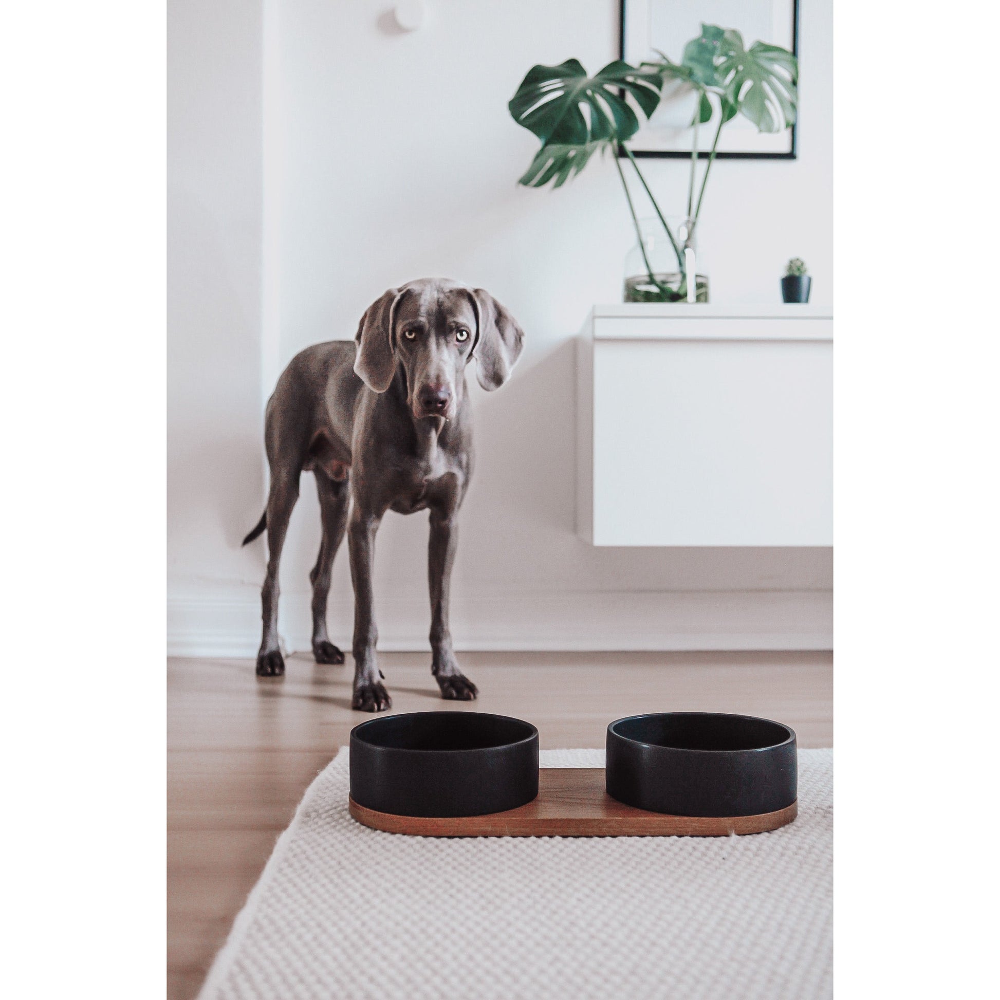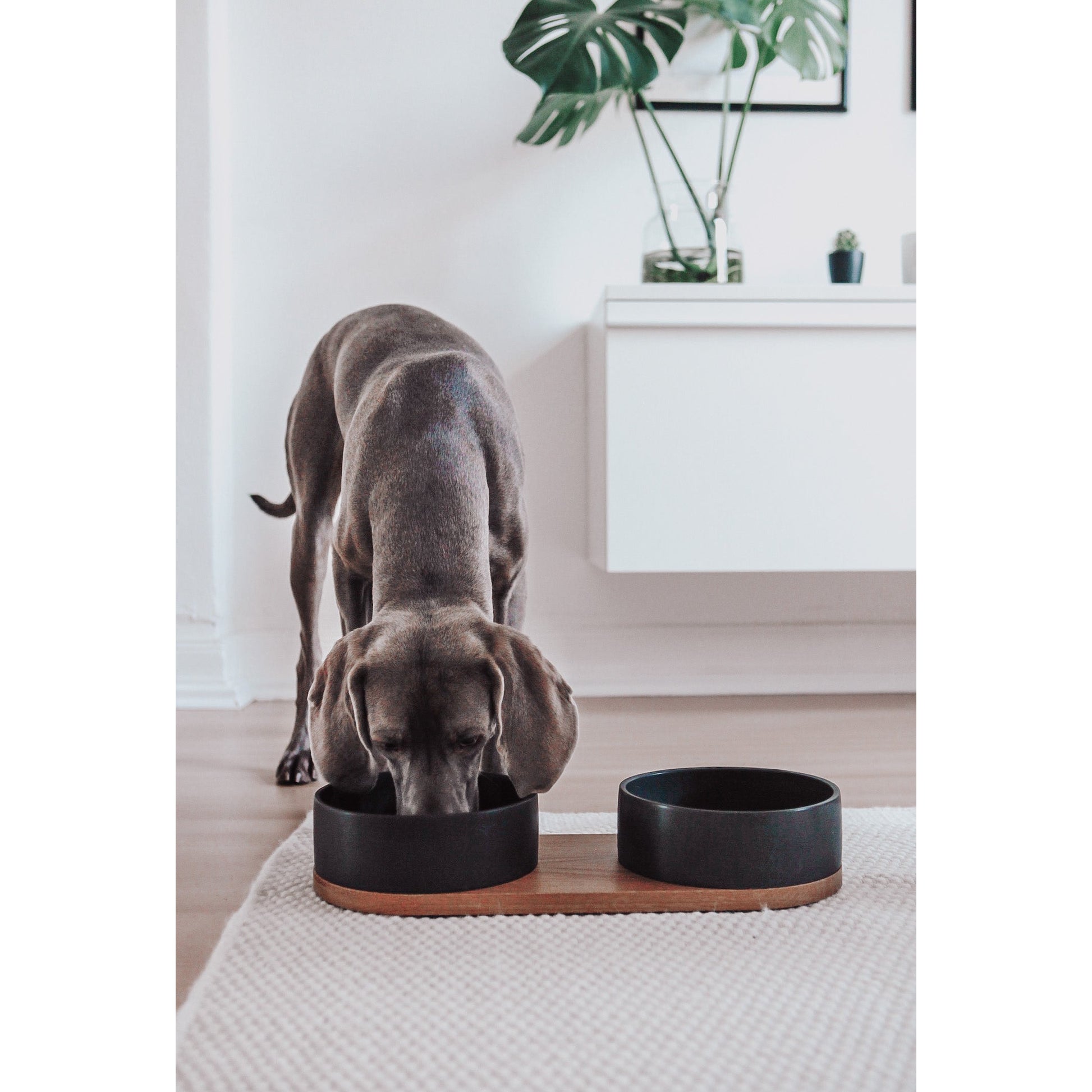 Die Basis des VUKU Hundebuffets ist aus Eiche natur. Naturholz ist anfällig für Verformungen und Verfärbungen bei Kontakt mit Wasser.