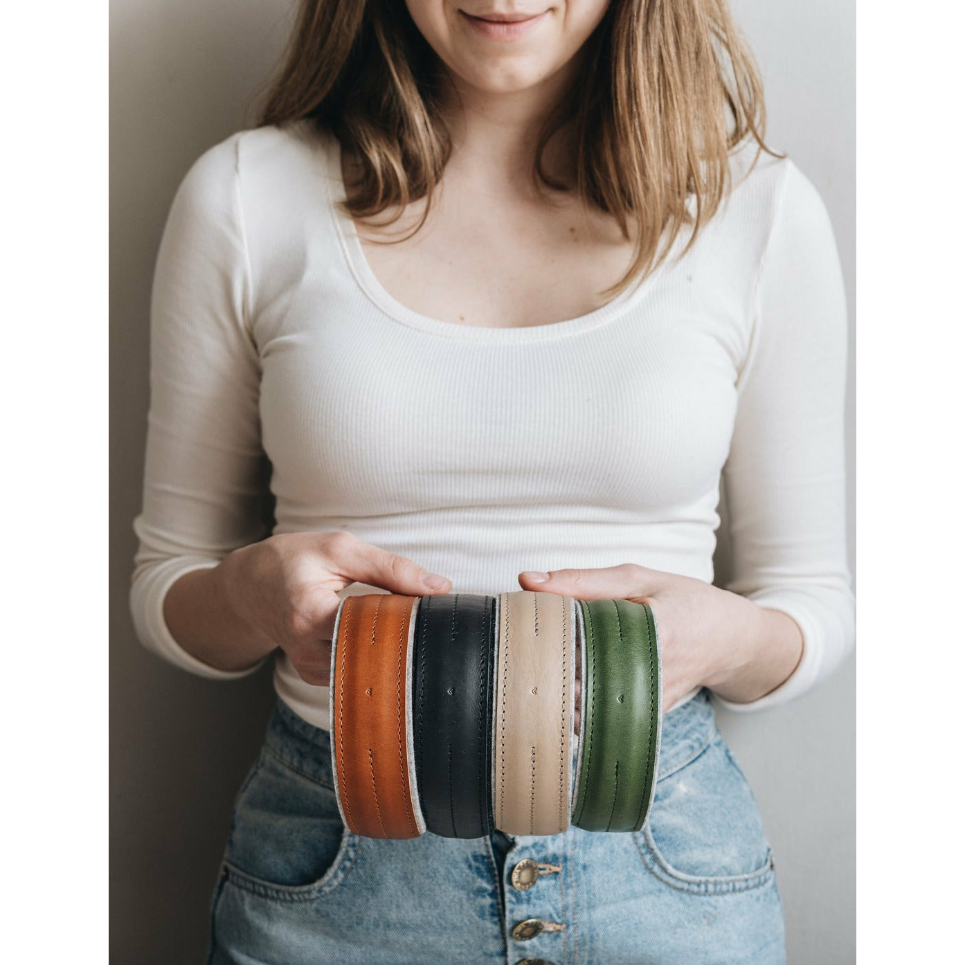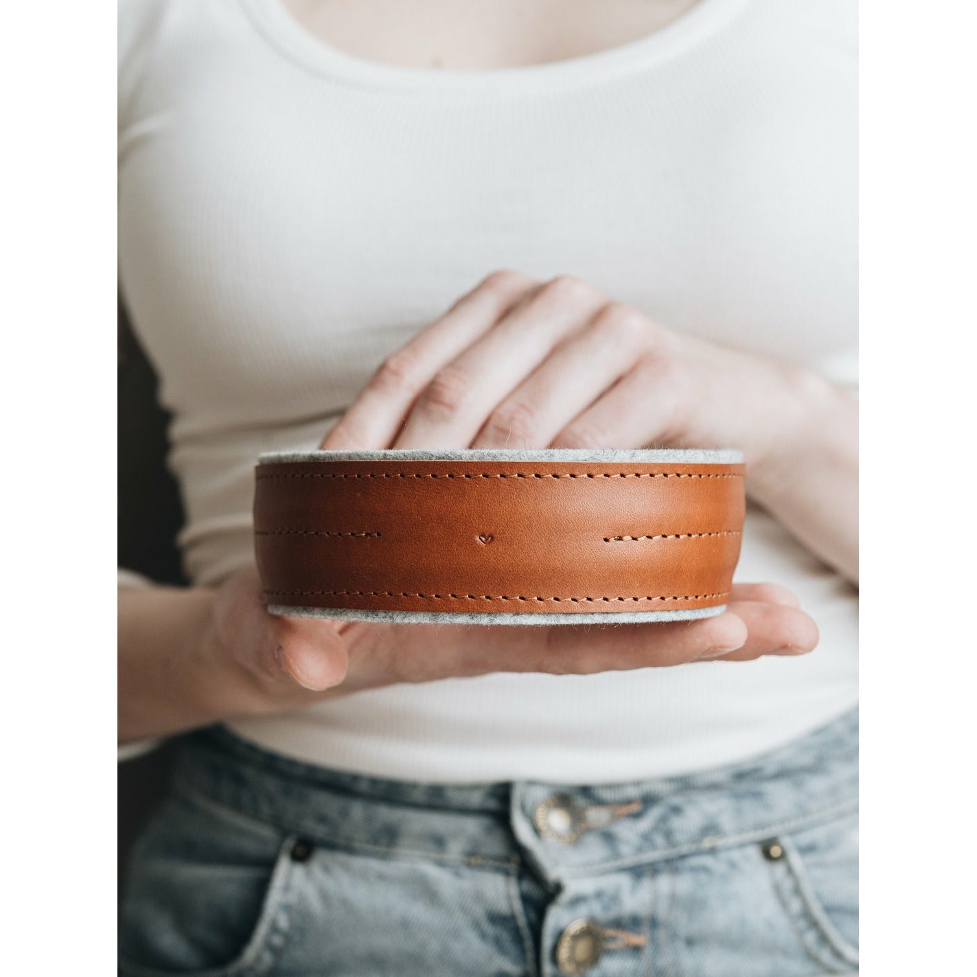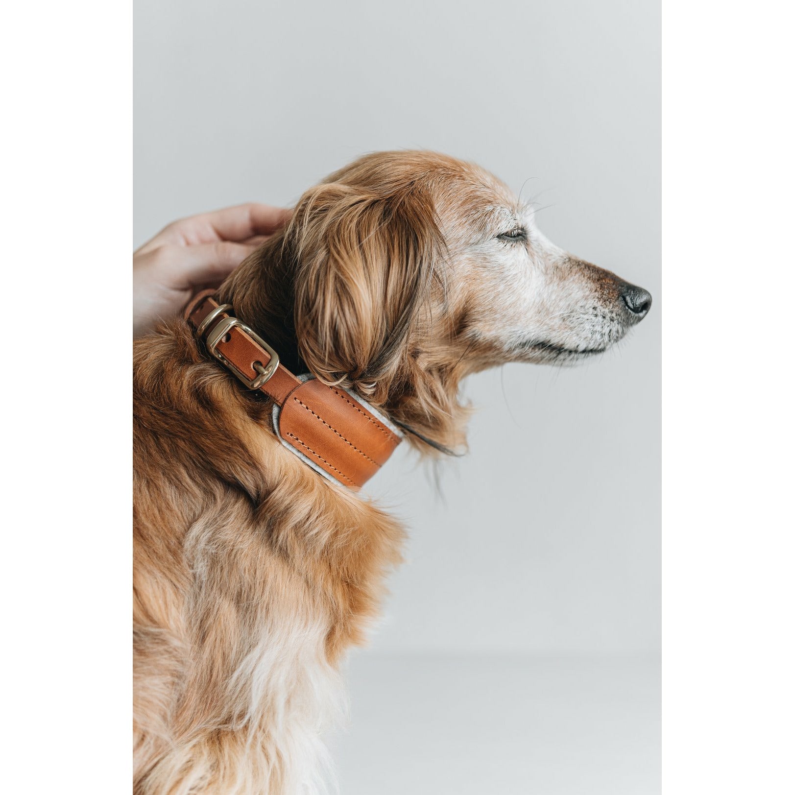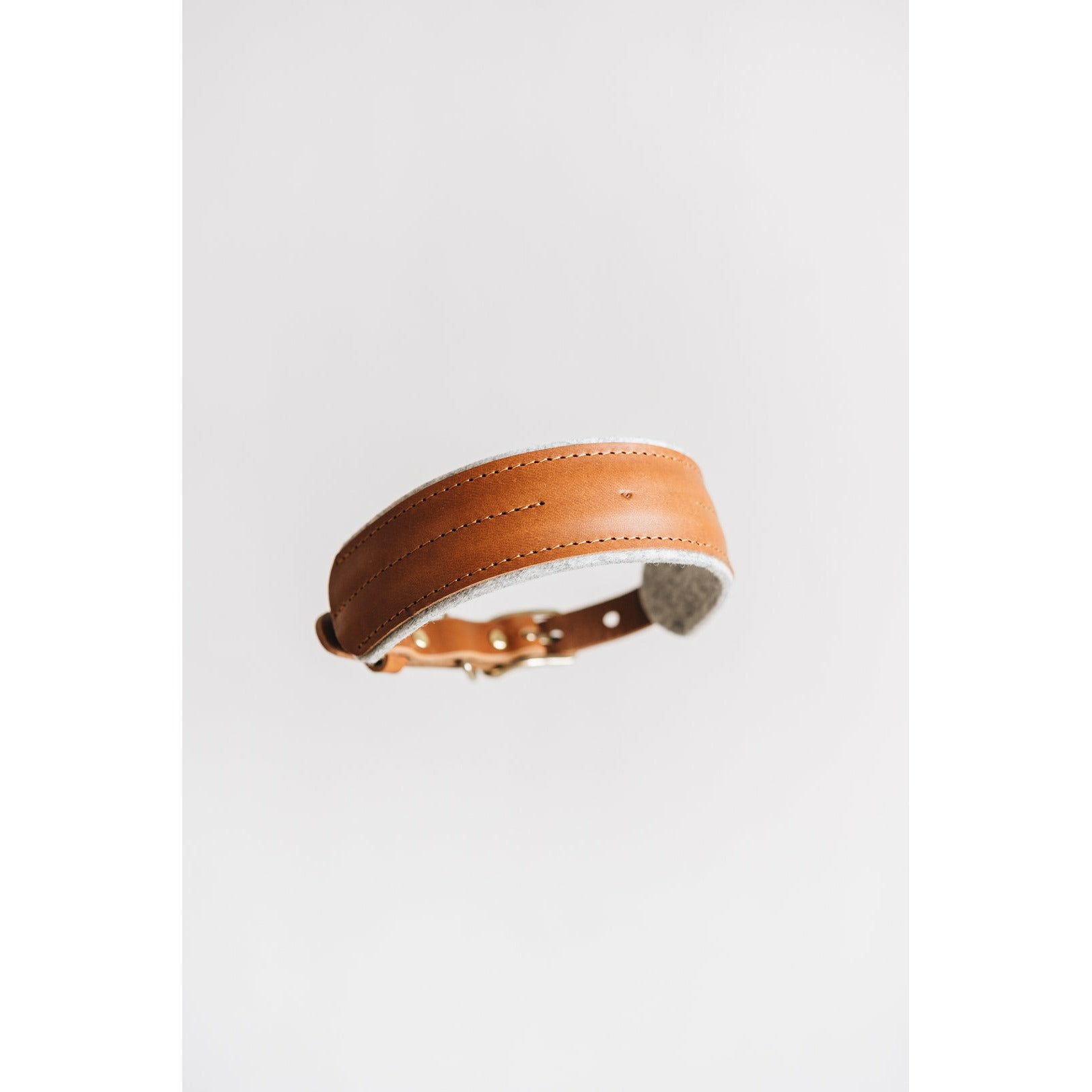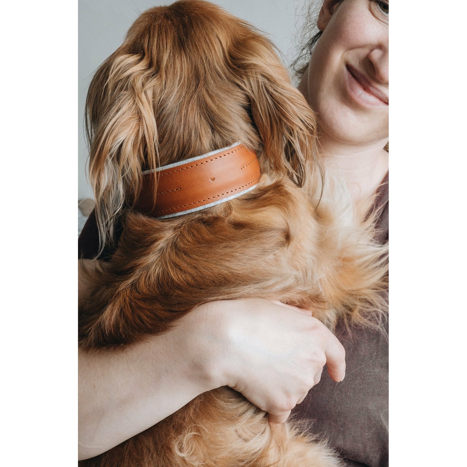 Äh Dieses Hundehalsband besteht aus pflanzlich gegerbtem Vollnarbenleder in Kombination mit reinem Wollfilz.