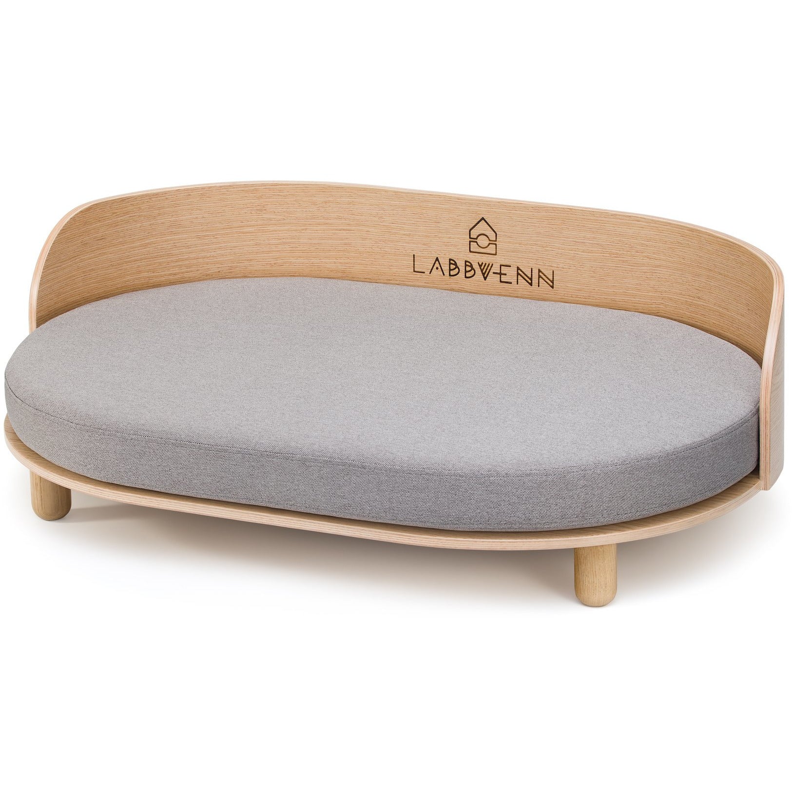 Der Holzsockel besteht aus hochwertigem, gebogenem Buchensperrholz, das in einem filigranen Bogen geformt ist. Er garantiert Komfort und eine stabile Ruheposition. Eine modische Ergänzung zu den Holzteilen ist das hellgraue Kissen, das mit großer Präzision aus hochwertigen Materialien hergestellt wird.
