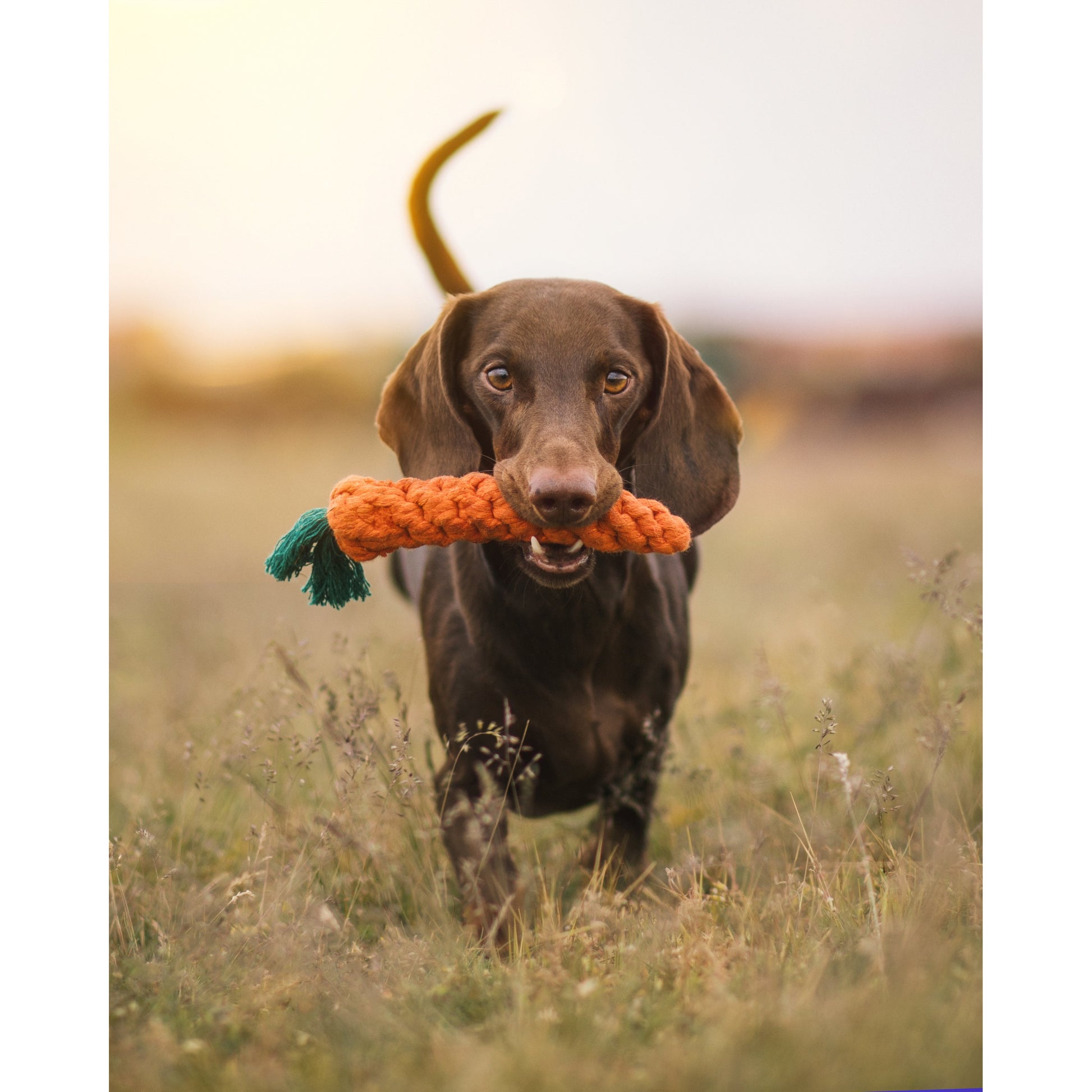 Die Swaggin Tails Möhre ist handgefertigt und aus ganz natürlichen Baumwollseil. Natürlich gefärbt, frei von Chemikalien und reinigt die Zähne deines Hundes.